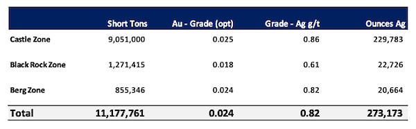 The Castle claim block covers an area of 9.6 sq. km and is located 13 km south of the Original Zone but still within the Eastside property. The Castle claims are covered by shallow alluvium of 10-30 metres with potential for increased resources and contain a near surface historical* oxidized resource estimate of 273,173 gold ounces as outlined in the table below: