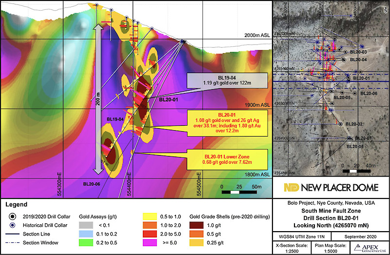 RC drilling at Bolo defines a 1.2 kilometer north-south trending corridor of gold-silver mineralization containing the South Mine Fault Zone, Uncle Sam, and Northeast Extension zones. Gold mineralization at Bolo exhibits characteristics of classic Carlin-type mineralization, including strong subvertical structural control in addition to evidence of gold mineralization extending laterally at low angles within favorable silty carbonate units. The relatively untested 500 m strike length South Mine Fault-Uncle Sam segment is particularly prospective and is the focus of New Placer’s 2020 exploration program designed to prove-out these structural and stratigraphic gold targets.