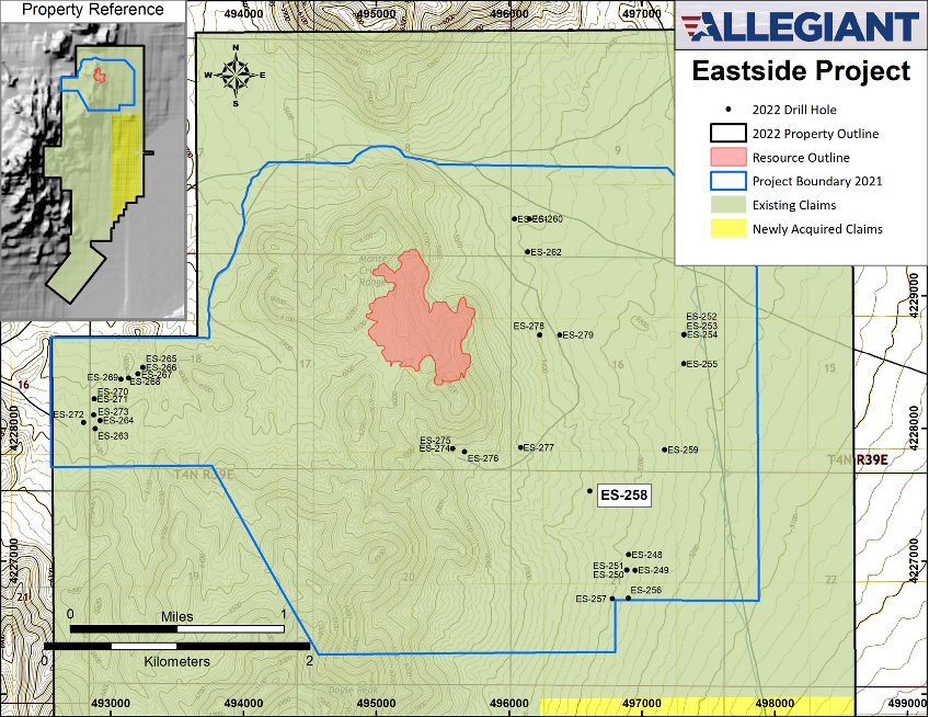 Allegiant owns 100% of 7 highly-prospective gold projects in the United States, 5 of which are located in the mining-friendly jurisdiction of Nevada. Four of Allegiant’s projects are farmed-out, providing for cost reductions and cash-flow. Allegiant’s flagship, district-scale Eastside project hosts a large and expanding gold resource and is located in an area of excellent infrastructure. Preliminary metallurgical testing indicates that both oxide and sulphide gold mineralization at Eastside is amenable to heap leaching.