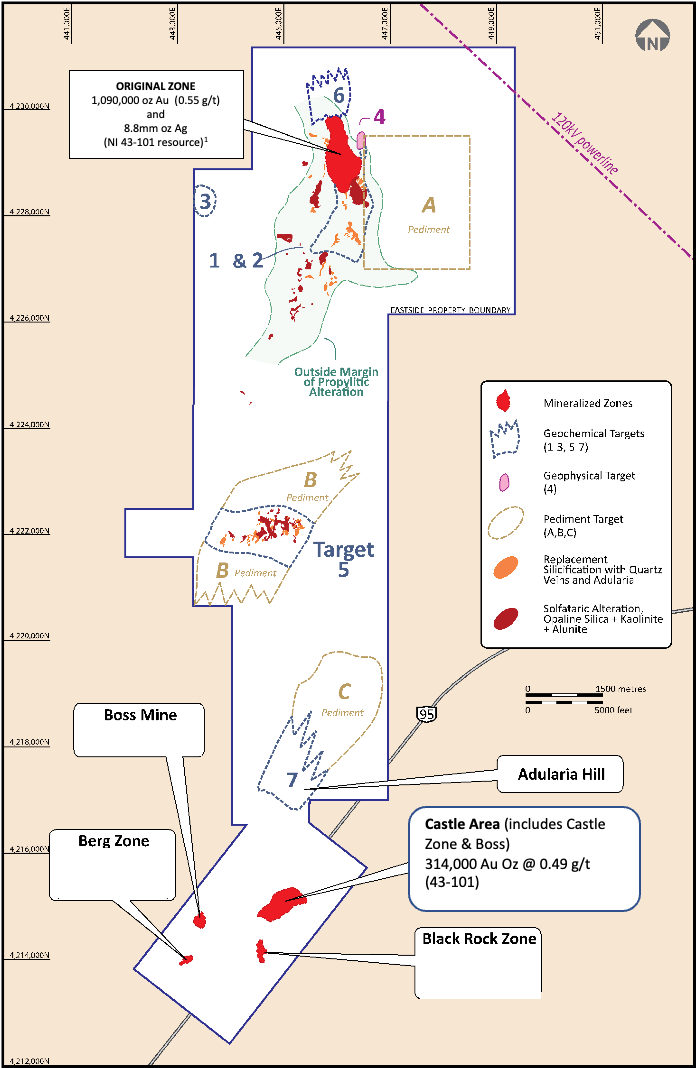* The updated resource estimate (“Updated Resource Estimate and NI 43-101 Technical Report, Eastside and Castle Gold-Silver Project Technical Report, Esmeralda County, Nevada”) conducted by Mine Development Associates (“MDA”) of Reno, Nevada, with an effective date of July 30, 2021, contained a pit-constrained Inferred Resources (cut-off grade of 0.15 g/t Au) of 61,730,000 tonnes grading 0.55 g/t Au and 4.4 g/t Ag at the Original Pit Zone (1,090,000 ounces gold and 8,700,000 ounces silver) and 19,986,000 tonnes grading 0.49 g/t Au at the Castle Area (314,000 ounces gold). A copy of the Eastside Technical Report can be found on SEDAR at www.sedar.com.
